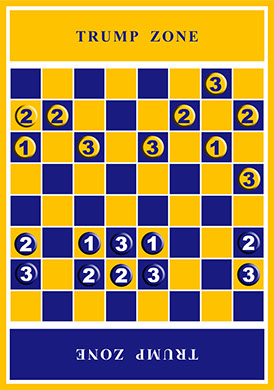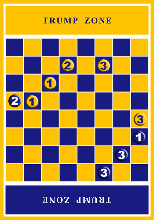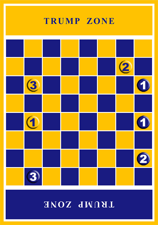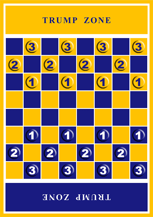 The game is played with two players on a checked board with a GOLD (Trump Zone) on one end of the game board and a BLUE (Trump Zone) on the alternate end of the board. Each player has 12 pieces. The 12 pieces are placed on the board as diagramed.